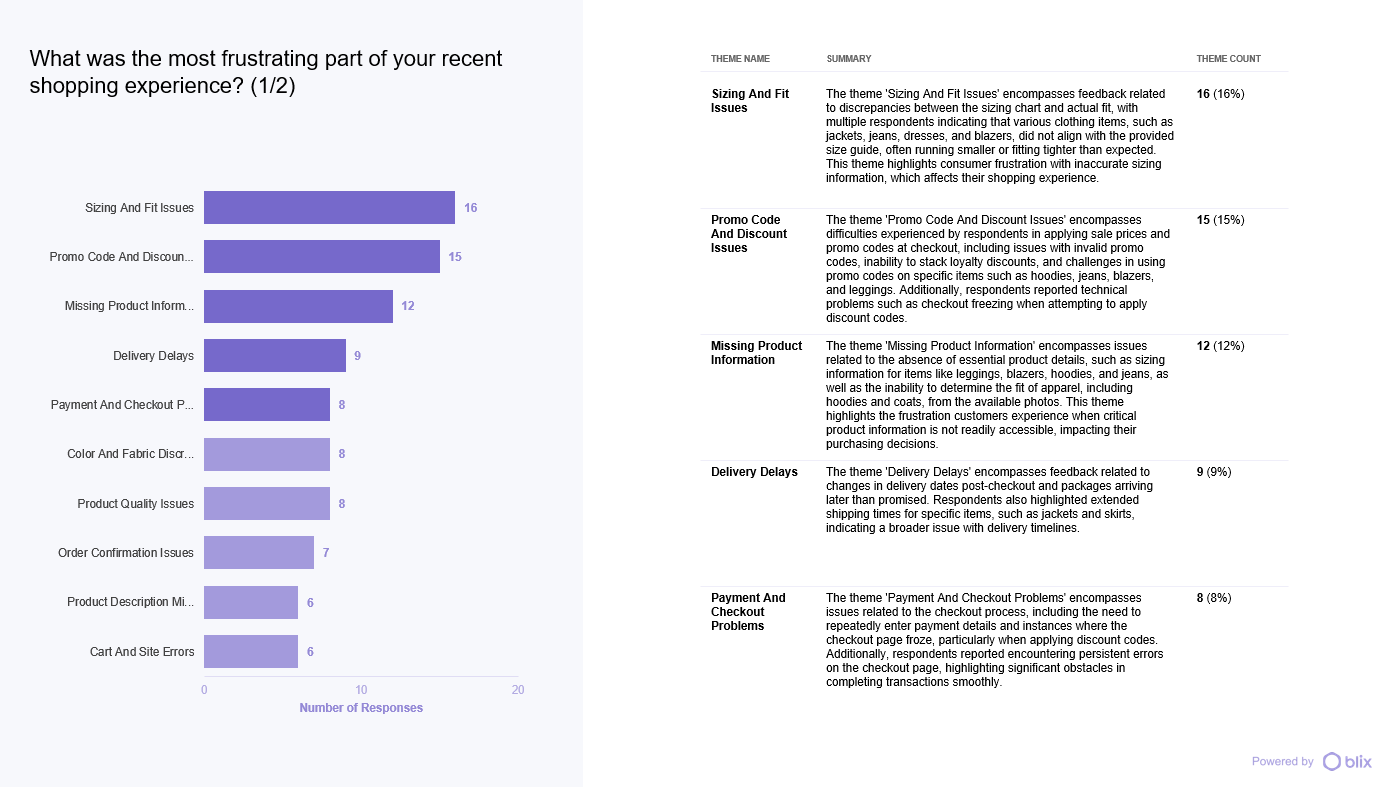 4.Analyze theme frequency: Blix will show how often each theme appears across responses, helping you identify recurring friction points such as checkout errors, shipping delays, or unclear payment issues.