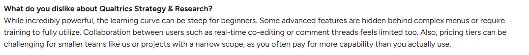 Qualtrics Text iQ is complicated to learn, which slows down onboarding and makes the early stages of analysis harder than they need to be. When a platform takes time to grasp, market research teams move slower, get frustrated, and spend more hours figuring out the tool than understanding the data. Take a look at this review: